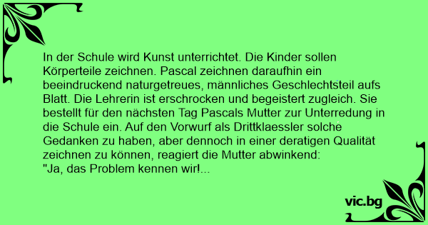 In der Schule wird Kunst unterrichtet. Die Kinder sollen Körperteile zeichnen. Pascal zeichnen daraufhin ein beeindruckend naturgetreues, männliches Geschlechtsteil aufs Blatt. Die Lehrerin ist erschrocken und begeistert zugleich. Sie bestellt für den nächsten Tag Pascals Mutter zur Unterredung in die Schule ein. Auf den Vorwurf als Drittklaessler solche Gedanken zu haben, aber dennoch in einer deratigen Qualität zeichnen zu können, reagiert die Mutter abwinkend: