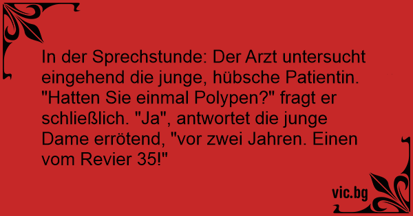 In der Sprechstunde: Der Arzt untersucht eingehend die junge, hübsche Patientin. "Hatten Sie einmal Polypen?" fragt er schließlich. "Ja", antwortet die junge Dame errötend, "vor zwei Jahren. Einen vom Revier 35!"