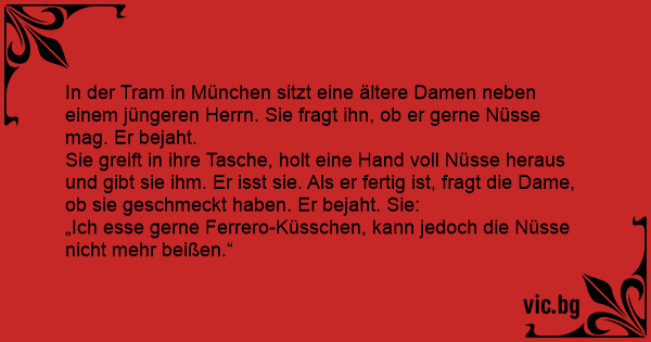 In der Tram in München sitzt eine ältere Damen neben einem jüngeren Herrn. Sie fragt ihn, ob er gerne Nüsse mag. Er bejaht.