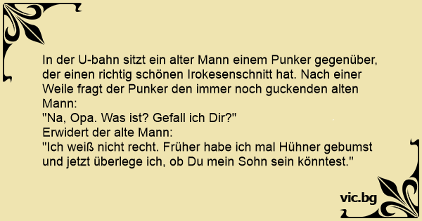 Der Bauer kommt in die Stadt und sitzt neben einem Punk im Bus. Der Alte schaut den Punk mit der roten Kammfrisur die ganze Zeit an. Da raunzt der Punk: „Was guckste denn so doof, alter Sack?“ Der...