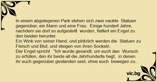 I mange år hadde to flotte statuer, en naken mann og en naken kvinne stått ved siden av hverandre ved innagangen til en offentlig park. Så en dag kom en engel ned fra himmelen og sa: - Nå har dere...