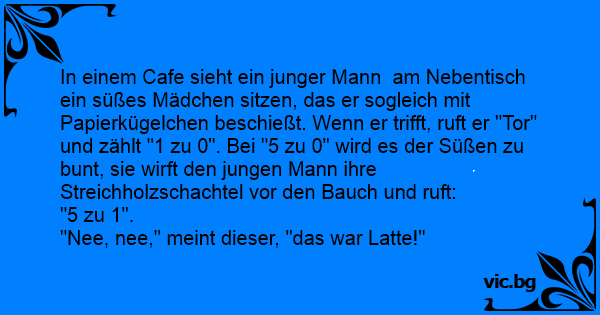 In einem Cafe sieht ein junger Mann am Nebentisch ein süßes Mädchen sitzen, das er sogleich mit Papierkügelchen beschießt. Wenn er trifft, ruft er "Tor" und zählt "1 zu 0". Bei "5 zu 0" wird es der Süßen zu bunt, sie wirft den jungen Mann ihre Streichholzschachtel vor den Bauch und ruft:
