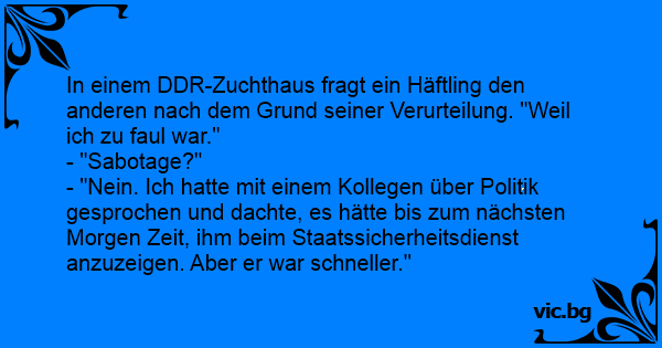 In einem DDR-Zuchthaus fragt ein Häftling den anderen nach dem Grund seiner Verurteilung. "Weil ich zu faul war."