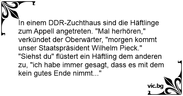 In einem DDR-Zuchthaus sind die Häftlinge zum Appell angetreten. "Mal herhören," verkündet der Oberwärter, "morgen kommt unser Staatspräsident Wilhelm Pieck."