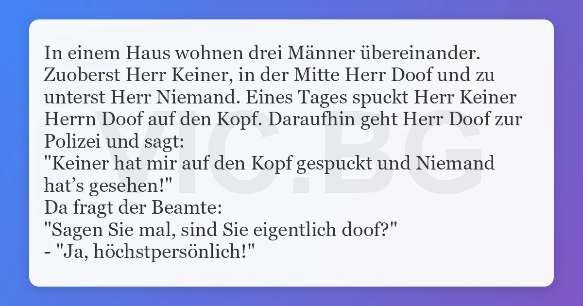 In einem Haus wohnen drei Männer übereinander. Zuoberst Herr Keiner, in der Mitte Herr Doof und zu unterst Herr Niemand. Eines Tages spuckt Herr Keiner Herrn Doof auf den Kopf. Daraufhin geht Herr Doof zur Polizei und sagt: "Keiner hat mir auf den Kopf gespuckt und Niemand hat’s gesehen!" Da fragt der Beamte: "Sagen Sie mal, sind Sie eigentlich doof?" - "Ja, höchstpersönlich!"