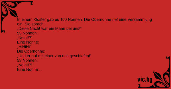 En dag samlade abbedissan alla 100 nunnorna i klostret och sa: - Nu har det hemska hänt, jag har hittat en kondom! 99 nunnor: - Flämt!!!!!!!!! 1 nunna: - Hihi!!!!!!!!!! - Och den är använd!...