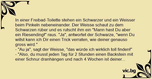 In einer Freibad-Toilette stehen ein Schwarzer und ein Weisser beim Рinкеln nebeneinander. Der Weisse schaut zu dem Schwarzen rüber und es rutscht ihm ein "Mann hast Du aber ein Riesending!" raus. "Ja", antwortet der Schwarze, "wenn Du willst kann ich Dir einen Trick verraten, wie deiner genauso gross wird."