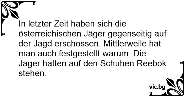 In letzter Zeit haben sich die österreichischen Jäger gegenseitig auf der Jagd erschossen. Mittlerweile hat man auch festgestellt warum. Die Jäger hatten auf den Schuhen Reebok stehen.