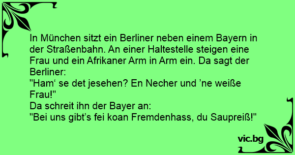 In München sitzt ein Berliner neben einem Bayern in der Straßenbahn. An einer Haltestelle steigen eine Frau und ein Afrikaner Arm in Arm ein. Da sagt der Berliner: