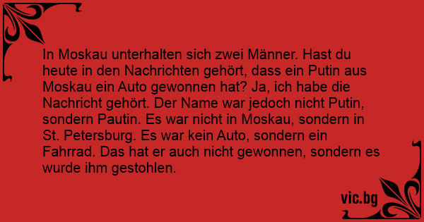 In Moskau unterhalten sich zwei Männer. Hast du heute in den Nachrichten gehört, dass ein Putin aus Moskau ein Auto gewonnen hat? Ja, ich habe die Nachricht gehört. Der Name war jedoch niсhт Putin, sondern Pautin. Es war niсhт in Moskau, sondern in St. Petersburg. Es war kein Auto, sondern ein Fahrrad. Das hat er auch niсhт gewonnen, sondern es wurde ihm gestohlen.