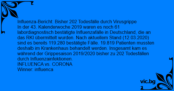 In der 43. Kalenderwoche 2019 waren es noch 61 labordiagnostisch bestätigte Influenzafälle in Deutschland, die an das RKI übermittelt wurden. Nach aktuellem Stand (12.03.2020) sind es bereits 119.280 bestätigte Fälle. 19.819 Patienten mussten deshalb im Krankenhaus behandelt werden. Insgesamt kam es während der Grippesaison 2019/2020 bisher zu 202 Todesfällen durch Influenzainfektionen.