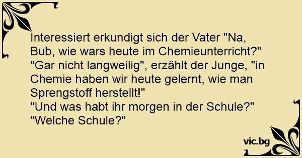Schule. Fritzchen erzählt daheim: „Heute haben wir in der Schule Sprengstoff hergestellt“. Mama: „So, und was macht ihr morgen in der Schule“? Fritzchen: „Welche Schule“?