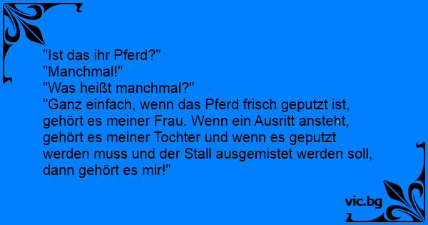 "Ganz einfach, wenn das Pferd frisch geputzt ist, gehört es meiner Frau. Wenn ein Ausritt ansteht, gehört es meiner Tochter und wenn es geputzt werden muss und der Stall ausgemistet werden soll, dann gehört es mir!"