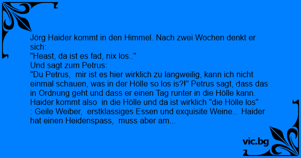 Schwupps, er steht in der Hölle und - keine Sau da. Keine Frauen, keine Orgien, kein Essen und kein Alkohol. Haider stutzt, geht zum Теufеl und sagt: