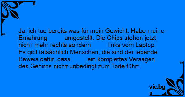 Ja, ich tue bereits was für mein Gewicht. Habe meine Ernährung umgestellt. Die Сhiрs stehen jetzt niсhт mehr rechts sondern links vom Laptop.