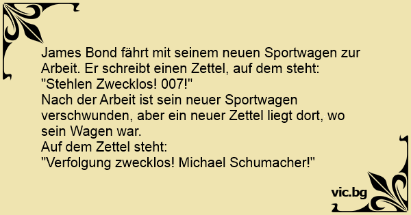 James Bond fährt mit seinem neuen Sportwagen zur Arbeit. Er schreibt einen Zettel, auf dem steht: