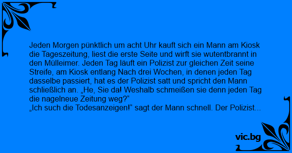 Пенсионер всяка сутрин отивал до будката за вестници, купувал си вестник, поглеждал първата му страница и го изхвърлял в близкото кошче за боклук. Варненски зевзек и вицаджия, всяка сутрин си купувал вестник от РЕП-а. Поглеждал челната страница и без да го чете, смачквал вестника и го хвърлял в кошчето. Веднъж продавачът го попитал: - Защо четеш само заглавията във вестника?! - Търся некролог - Некролозите не ги печатат на първа страница?! - Този, които аз чакам, ще го напечатат - Муж, смотрю, ты новости не читаешь, а только заголовки просматриваешь? - Некролог жду. - Так некрологи же не на новостных сайтах печатают. - Тот, что я жду, напечатают везде. Jeden Morgen kauft ein Mann in der DDR am Kiosk das Neue Deutschland, guckt auf die erste Seite und wirft die Zeitung dann in den Papierkorb. Eines Tages spricht der Zeitungsverkäufer ihn an: "Ich... In Moskau geht ein altes Mütterchen in den Zeitungsladen, kauft sich eine Zeitung, blickt kurz drauf und schmeißt sie unmittelbar danach weg. Am nächsten Tag geht das Mütterchen wieder in den... Starica kupuje Politiku svako jutro, pogleda naslovnu pa je besno zgužva i zgazi. Jednog dana prodavačica je pita: - Zašto baba kupuješ novine kad ne čitaš? - Ma samo gledam čituje! - E budalo pa...