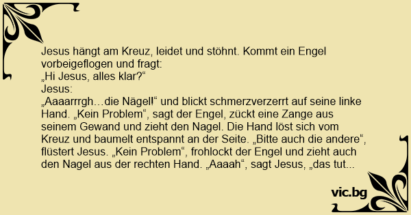 „Aaaarrrgh…die Nägel!“ und blickt schmerzverzerrt auf seine linke Hand. „Kein Problem“, sagt der Engel, zückt eine Zange aus seinem Gewand und zieht den Nagel. Die Hand löst sich vom Kreuz und baumelt entspannt an der Seite. „Bitte auch die andere“, flüstert Jesus. „Kein Problem“, frohlockt der Engel und zieht auch den Nagel aus der rechten Hand. „Aaaah“, sagt Jesus, „das тuт gut! Und jetzt die a…aah…aaahr…aaaaaahrrrrrg…!“