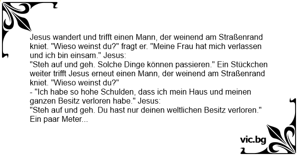 Jesus wandert und trifft einen Mann, der weinend am Straßenrand kniet. "Wieso weinst du?" fragt er. "Meine Frau hat mich verlassen und ich bin einsam." Jesus: