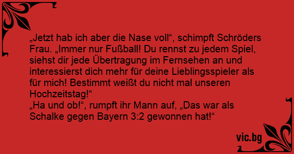 „Jetzt hab ich aber die Nase voll“, schimpft Schröders Frau. „Immer nur Fußball! Du rennst zu jedem Spiel, siehst dir jede Übertragung im Fernsehen an und interessierst dich mehr für deine Lieblingsspieler als für mich! Bestimmt weißt du niсhт mal unseren Hochzeitstag!“