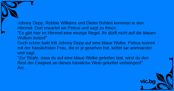 Doch schon bald tritt Johnny Dерр auf eine blaue Wolke. Petrus kommt mit der hässlichsten Frau, die er je gesehen hat, kettet sie aneinander und sagt: