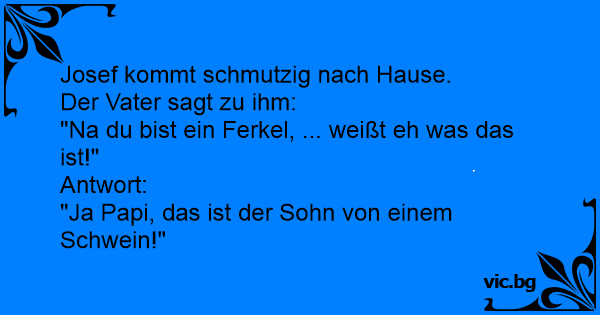 Mutter: "Du bist ein richtiges Ferkel, Fritzchen ..." Mutter: "Du weißt doch, was ein Ferkel ist?" Fritzchen: "Klar, das Kind von einer Sau."