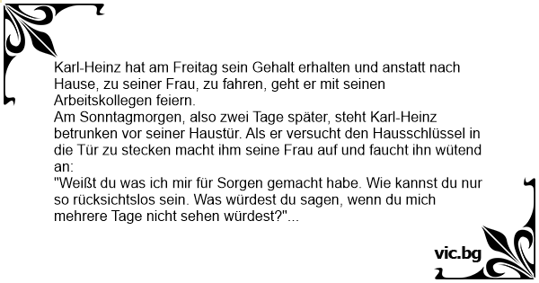 Am Sonntagmorgen, also zwei Tage später, steht Karl-Heinz betrunken vor seiner Haustür. Als er versucht den Hausschlüssel in die Tür zu stecken macht ihm seine Frau auf und faucht ihn wütend an: