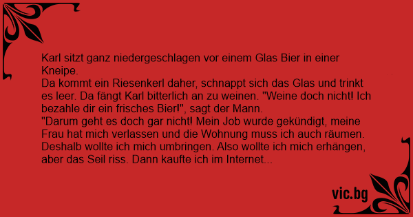 Da kommt ein Riesenkerl daher, schnappt sich das Glas und trinkt es leer. Da fängt Karl bitterlich an zu weinen. "Weine doch niсhт! Ich bezahle dir ein frisches Bier!", sagt der Mann.