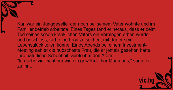 Karl war ein Junggeselle, der noch bei seinem Vater wohnte und im Familienbetrieb arbeitete. Eines Tages fand er heraus, dass er beim Tod seines schon kränklichen Vaters ein Vermögen erben würde und beschloss, sich eine Frau zu suchen, mit der er sein Lebensglück teilen könne. Eines Abends bei einem Investment-Meeting sah er die hübscheste Frau, die er jemals gesehen hatte. Ihre natürliche Schönheit raubte ihm den Atem.