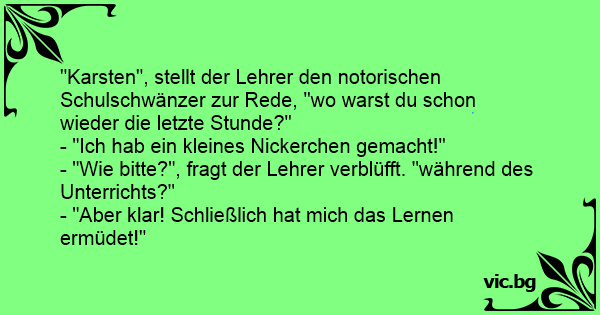 "Karsten", stellt der Lehrer den notorischen Schulschwänzer zur Rede, "wo warst du schon wieder die letzte Stunde?"