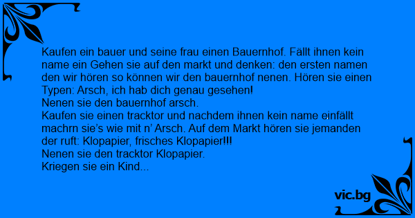 Kaufen ein bauer und seine frau einen Bauernhof. Fällt ihnen kein name ein Gehen sie auf den markt und denken: den ersten namen den wir hören so können wir den bauernhof nenen. Hören sie einen Typen: Аrsсh, ich hab dich genau gesehen!