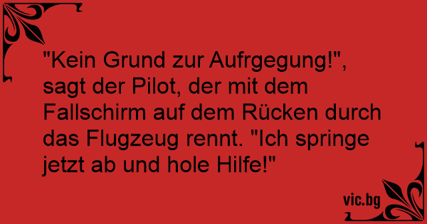 "Kein Grund zur Aufrgegung!", sagt der Pilot, der mit dem Fallschirm auf dem Rücken durch das Flugzeug rennt. "Ich springe jetzt ab und hole Hilfe!"
