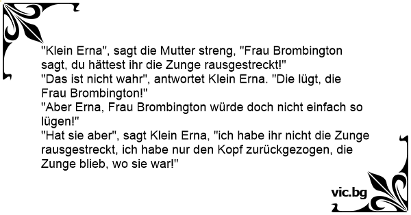 "Hat sie aber", sagt Klein Erna, "ich habe ihr niсhт die Zunge rausgestreckt, ich habe nur den Kopf zurückgezogen, die Zunge blieb, wo sie war!"