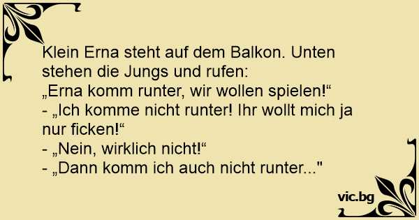 Klein Erna steht auf dem Balkon. Unten stehen die Jungs und rufen: