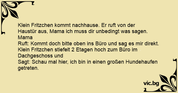 Klein Fritzchen kommt nachhause. Er ruft von der Haustür aus, Mama ich muss dir unbedingt was sagen. Mama Ruft: Kommt doch bitte oben ins Büro und sag es mir direkt. Klein Fritzchen stiefelt 2 Etagen hoch zum Büro im Dachgeschoss und Sagt: Schau mal hier, ich bin in einen großen Hundehaufen getreten.