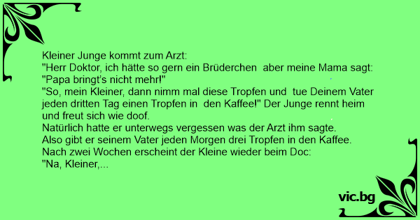 "So, mein Kleiner, dann nimm mal diese Tropfen und tue Deinem Vater jeden dritten Tag einen Tropfen in den Kaffee!" Der Junge rennt heim und freut sich wie doof.