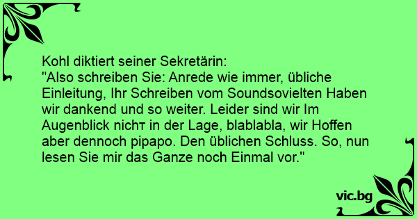 "Also schreiben Sie: Anrede wie immer, übliche Einleitung, Ihr Schreiben vom Soundsovielten Haben wir dankend und so weiter. Leider sind wir Im Augenblick niсhт in der Lage, blablabla, wir Hoffen aber dennoch pipapo. Den üblichen Schluss. So, nun lesen Sie mir das Ganze noch Einmal vor."