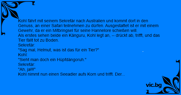 Kohl fährt mit seinem Sekretär nach Australien und kommt dort in den Genuss, an einer Safari teilnehmen zu dürfen. Ausgestattet ist er mit einem Gewehr, da er ein Mitbringsel für seine Hannelore schießen will.