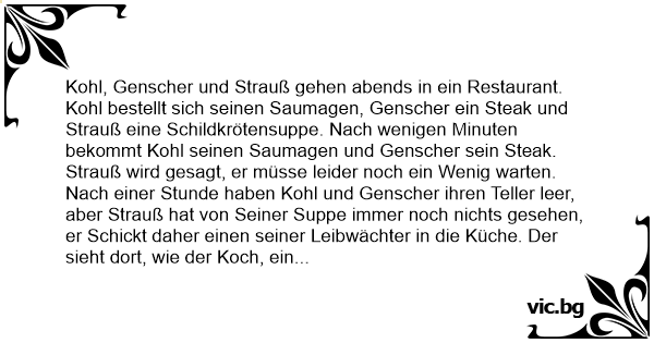 Strauß wird gesagt, er müsse leider noch ein Wenig warten. Nach einer Stunde haben Kohl und Genscher ihren Teller leer, aber Strauß hat von Seiner Suppe immer noch nichts gesehen, er Schickt daher einen seiner Leibwächter in die Küche. Der sieht dort, wie der Koch, ein Beil in Der Hand gelangweilt vor einem Tisch steht, auf Dem die Schildkröte liegt. Auf seine Frage, was Nun mit der Suppe für Strauß sei, antwortete der Koch, er könne der Schildkröte den Kopf niсhт Abschlagen, da diese ihn niсhт aus dem Panzer Strecke.