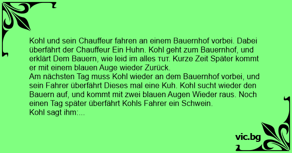 Kohl und sein Chauffeur fahren an einem Bauernhof vorbei. Dabei überfährt der Chauffeur Ein Huhn. Kohl geht zum Bauernhof, und erklärt Dem Bauern, wie leid im alles тuт. Kurze Zeit Später kommt er mit einem blauen Auge wieder Zurück.