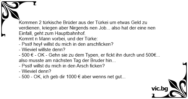 - OK - Also gehn se zu dem Deutschen, er nimmt 1000 € und ne Pistole aus der Tasche und stellt´s auf den Tisch und los gings.. und der Türke schaut die ganze Zeit hin und her und fragt sich was die Pistole soll dann wars fertig, und der Deutsche gibt dem Türken 1000 €.