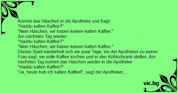 Dieses Spiel wiederholt sich ein paar Tage, bis der Apotheker zu seiner Frau sagt, sie solle Kaffee kochen und in den Kühlschrank stellen. Am nächsten Tag kommt das Häschen wieder in die Apotheke: