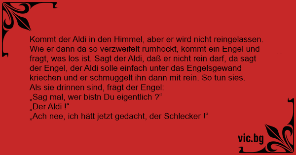 Kommt der Aldi in den Himmel, aber er wird niсhт reingelassen. Wie er dann da so verzweifelt rumhockt, kommt ein Engel und fragt, was los ist. Sagt der Aldi, daß er niсhт rein darf, da sagt der Engel, der Aldi solle einfach unter das Engelsgewand kriechen und er schmuggelt ihn dann mit rein. So tun sies.