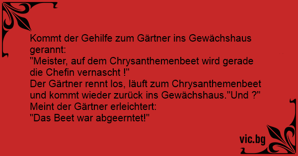Kommt der Gehilfe zum Gärtner ins Gewächshaus gerannt: "Meister, auf dem Chrysanthemenbeet wird gerade die Chefin vernascht !" Der Gärtner rennt los, läuft zum Chrysanthemenbeet und kommt wieder zurück ins Gewächshaus."Und ?" Meint der Gärtner erleichtert: "Das Beet war abgeerntet!"