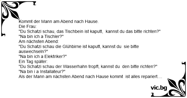 Als der Mann am nächsten Abend nach Hause kommt ist alles repariert. Er fragt die Frau wie es kommt, dass alles gerichtet ist. Sie: