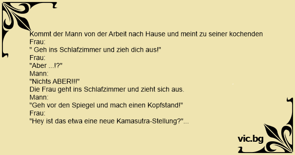 Kommentarlos spreizt sie die Beine. Kommt der Mann ins Zimmer, steckt seinen Kopf zwischen ihre Beine, guckt in den Spiegel und meint: