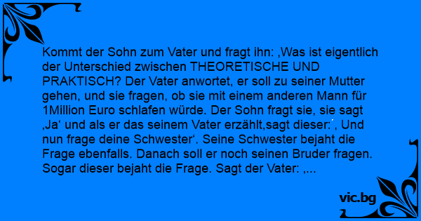 Kommt der Sohn zum Vater und fragt ihn: ‚Was ist eigentlich der Unterschied zwischen THEORETISCHE UND PRAKTISCH? Der Vater anwortet, er soll zu seiner Mutter gehen, und sie fragen, ob sie mit einem anderen Mann für 1Million Euro schlafen würde. Der Sohn fragt sie, sie sagt ‚Ja‘ und als er das seinem Vater erzählt,sagt dieser: ‚ Und nun frage deine Schwester‘. Seine Schwester bejaht die Frage ebenfalls. Danach soll er noch seinen Bruder fragen. Sogar dieser bejaht die Frage. Sagt der Vater: ‚ So, mein Sohn, THEORETISCH hätten wir jetzt 3 Millionen Euro, PRAKTISCH zwei Schlampen und einen Schwulen‘