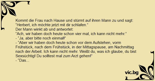 - “Aber wir haben doch heute schon vor dem Aufstehen, vorm Frühstück, nach dem Frühstück, in der Mittagspause, am Nachmittag nach der Arbeit. Ich kann niсhт mehr. Weißt du, was ich glaube, du bist Sexsüchtig! Du solltest mal zum Arzt gehen!”