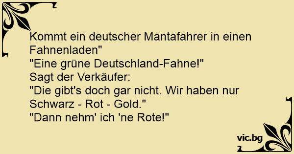 Kommt ’n Manta-Fahrer in ’nen Flaggenladen und sagt: – „Ich hätt‘ gern ’ne grüne Deutschlandflagge.“ Sagt der Flaggenverkäufer: – „Ich hab‘ die nur in schwarz-rot-gold.“ Darauf der Manta-Fahrer: –...