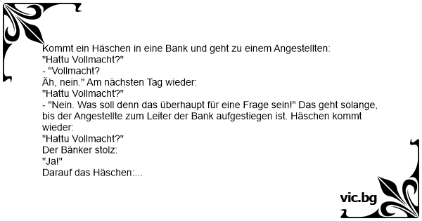 - "Nein. Was soll denn das überhaupt für eine Frage sein!" Das geht solange, bis der Angestellte zum Leiter der Bank aufgestiegen ist. Häschen kommt wieder: